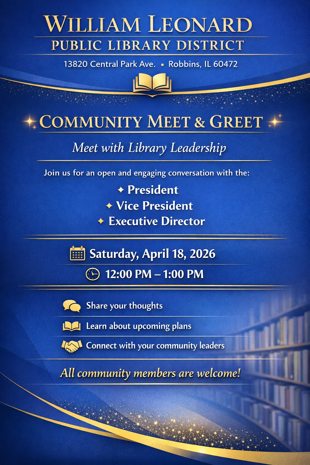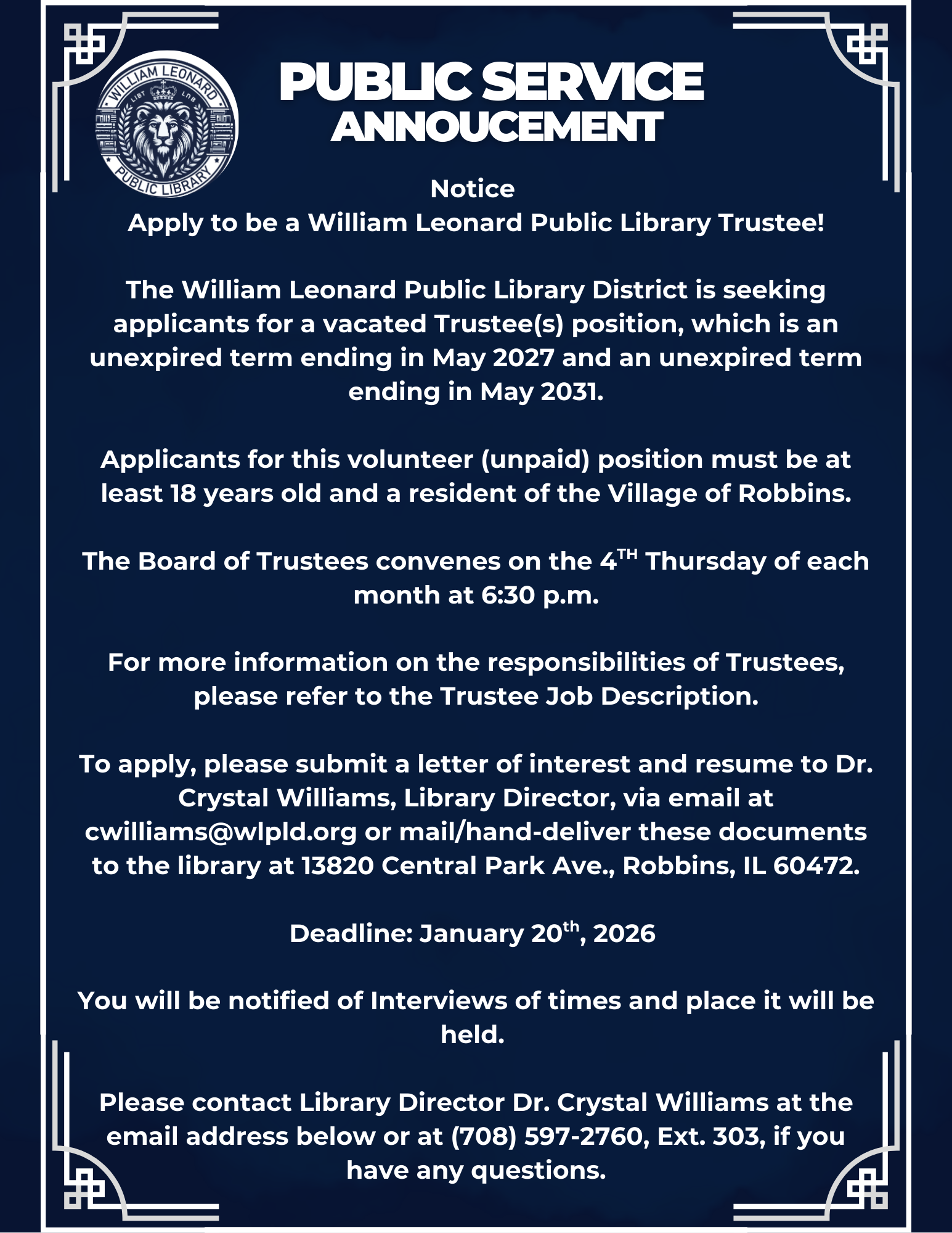 The William Leonard Public Library District is deeply committed to fostering a vibrant community spirit. We actively engage with local residents through a variety of programs and services designed to meet the diverse needs of our patrons. From hosting educational workshops to organizing cultural events, our library serves as a hub of learning and interaction. We collaborate with local schools, businesses, and organizations to enhance the quality of life in Robbins and surrounding areas. Our aim is to create a welcoming environment where everyone feels valued and inspired to learn.